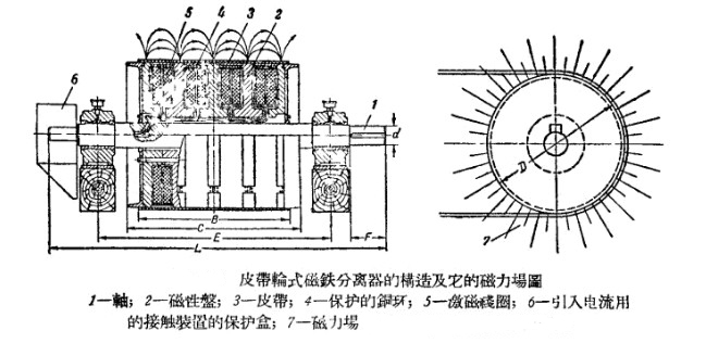 在皮帶輪式分離器內,沿著輪子的轉動其表面會產生強大的磁場,在較小直徑處的磁場達到750-900奧斯特,較大直徑處磁場達到1200-1400奧斯特,當即將進行球磨機粉碎的物料內金屬塊落到這個磁場時,就會被吸進并貼在筒上,然后脫落而被皮帶擲落到分離器下方的特殊卸斗內。其具體結構如圖: