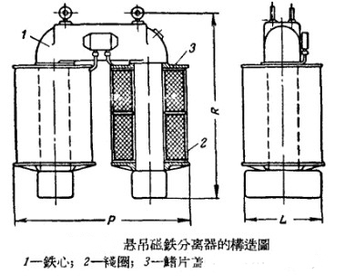 球磨機運轉中所用的懸吊磁鐵分離器則主要由一些馬蹄形的鐵心構成,其上繞有線圈,而下段裝有的端部。經過此設備分離出來的金屬塊會在人工作用除去,具體結構如下: